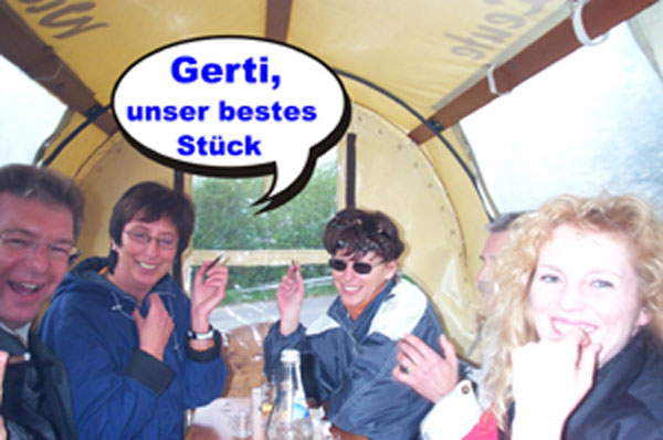endlich gibt es mal wieder was anständiges zum Thema Aktion zu berichten. Der 1. Mai oder der üble Tag danach genannt. Saugladd, Saugladd. Denn wie 2 Wochen zuvor in einer Käääääswirtschaft ( so eine Art Besenwirtschaft " Kneipe zum Rüsseln ", halt mit Käse ) in unserem Freundeskreis zur Debatte stand , hat es sich auch am 1. Mai ereignet. Kurvenkarle war das Stichwort. Und so kam es, dass wir (Otto, Hanne, Carmen, Sigge, Gerti, Biggi, Fränki, Bärbel, s 'Luisle, Ich, der Kurvenkarle und seine Gehilfin ) + den nicht zu vergessenen Pferchen Whisky u. Asterix auf eine gemütliche Rüsseltour gingen. O.K.böse Zungen am Wegesrand unserer Fahrt sagten auch Promilleexpress zu unserem Unternehmen (was nicht unbedingt falsch war). Lange Rede kurzer Sinn " ich möchte nicht lange darüber berichten, denn ich finde die eingefügten Bilder sprechen für UNS " sich".