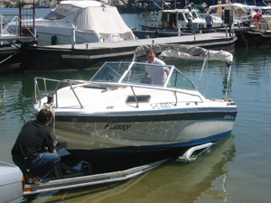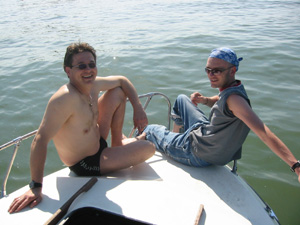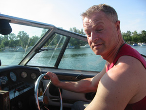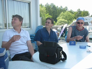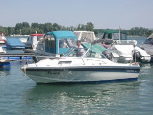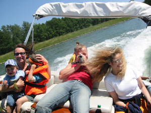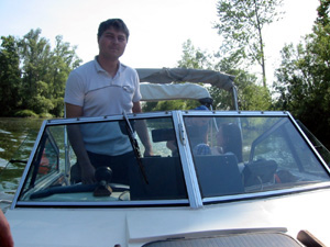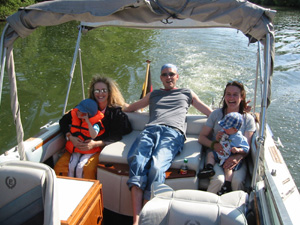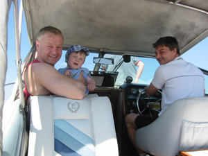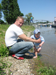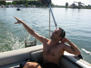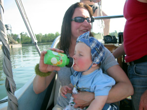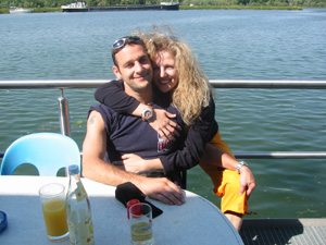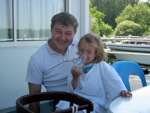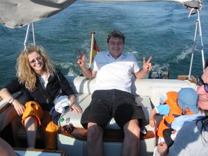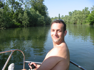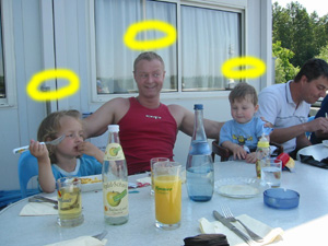 Eine Rheinfahrt, die ist lustig, eine Rheinfahrt, die ist schön.............lalallllllaaaaaa, lala. Jauuuuuu und wie es der Zufall so will heißt dieser Funny, und wird vom Kapitän mit dem wohlklingenden Namen Jürgen >>AAAAAAAAA<< gesteuert. Jürgen ( Bruder von meinem Schwager) lud ein zu einem gemütlichen Tourchen auf dem, an diesem Tage herrlich in Sonnenschein erstrahlenden Rhein. Familie Schöttle ( mein Schwesterherz mit Familie: Anna, Nic, Thomas "Schötti") Stefan, Christian, Jürgen, s' Luisle und ich trafen uns an einem kleinen Anlegeplatz auf der französischen Seite. Der Start der Bootsausfahrt begann leider nicht so wie sich unser Kapitän Jürgen vorgestellt hat, denn seine geliebte Funny wollte ihren Außenborder einfach nicht absenken. Und so startete die Ausfahrt etwas hektischer als eigentlich geplant. Aber kein wirkliches Problem für unseren Bootsmann und Helfer, die bald wieder Herr der Lage waren und nach einer kleinen Fahrt ins französische Dörfchen eine spezielle Sicherung für den restlichen Verlauf besorgt hatten. Yipieeeeeeeeeeeeeeeeeeeeee und dann war es soweit, dass wir alle in der Funny Platz nahmen. Schweigsame Stille beim Verlassen des Anlegeplatzes kurzer Blick rechts, links und ab die Post - Vollgas voraus GEIL wie das Boot in die Wellen der großen Frachter knallte und das Wasser an den Flanken vorbeispritzte "Achtung Wiederholung" Yipieeeeeeeeeeeeeeeeee, Hurraaaaaaaaaaaaaaaaaa, Yearrrrrrrrrrrrrrrrrrrrrrrrr. Als dann so um die Mittagszeit langsam der Hunger an Bord sich breit machte, steuerten wir ein gemütliches Restaurant direkt am Wasser gelegen an, um uns in gemütlicher Runde die Bäuche vollzuschlagen. Man beachte bitte, dass auf Wunsch ( Name: werde ich natürlich nicht preis gegeben) zuuuuuuuuuufällig geschossenem Bild, das unseren Schötti mit den Kindern in absoluter relaxter Pose und alles in griffhabender Mimik zeigt. Hi, Hi....... ,nachdem wir wieder wohl gestärkt waren ging es wieder den Rhein hinunter. An dieser Stelle möchte ich nur kurz auf meine beruhigende Fahrweise beim Steuern der Funny hinweisen, die selbst mein Neffe Nic zu einem Nickerchen einlud. Erstaunlich wie sich der Zwerg entwickelt bei gelassener Vollgasstellung (muss wohl in er Familie liegen). Aber genauso schön wie Speed ist, das mit Standgas Tuckern durch einen der kleineren Nebenzweige............Herlich. Es ist einfach schwer diesen tollen Tag mit all dem Spaß, den wir hatten zu beschreiben, daher würde ich einfach nur sagen schaut euch die eingefügten Bilder an und lasst sie auf euch wirken. Sowie die Fotos auf uns ein nicht endendes Grinsen ins Gesicht zaubert. (Boaaaaaaaaaa, ich glaub ich muss bald ein Buch verfassen bei dieser Poesie und Wortwahl)